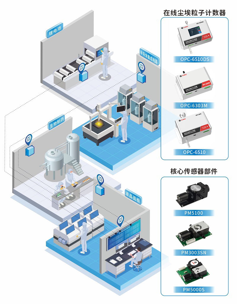 K8凯发娱乐旗舰光电基于12年光散射技术的研究与创新,推出了在线尘埃粒子计数器OPC-6500F、OPC-6303M和OPC-6510,以及核心零部件激光尘埃粒子计数传感器PM5000S、PM3003NS和PM5100,可广泛应用于百级、千级、万级、十万级等洁净室环境。